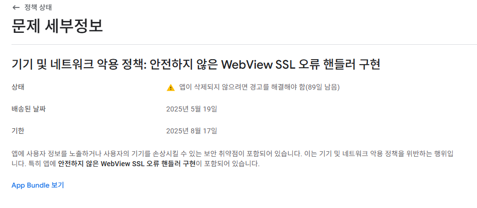 끼리끼리를 업데이트하려고 구글플레이 콘솔에 들어갔더니 이런 경고가 표시됨